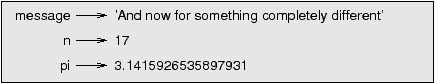 They’re strings. When you type a large integer, you might be tempted to use commas between groups of three digits, as in 1,000,000. This is not a legal integer in Python, but it is legal: >>> print 1,000,000 1 0 0 Well, that’s not what we expected at all! Python interprets 1,000,000 as a comma-separated sequence of integers, which it prints with spaces between. This is the first example we have seen of a semantic error: the code runs without producing an error message, but it doesn’t do the “right” thing. 2.2 VariablesOne of the most powerful features of a programming language is the ability to manipulate variables. A variable is a name that refers to a value. An assignment statement creates new variables and gives them values: >>> message = 'And now for something completely different' >>> n = 17 >>> pi = 3.1415926535897931 This example makes three assignments. The first assigns a string to a new variable named message; the second gives the integer 17 to n; the third assigns the (approximate) value of π to pi. A common way to represent variables on paper is to write the name with an arrow pointing to the variable’s value. This kind of figure is called a state diagram because it shows what state each of the variables is in (think of it as the variable’s state of mind). This diagram shows the result of the previous example: ![]() To display the value of a variable, you can use a print statement: >>> print n 17 >>> print pi 3.14159265359 The type of a variable is the type of the value it refers to. >>> type(message) <type 'str'> >>> type(n) <type 'int'> >>> type(pi) <type 'float'> Exercise 1
