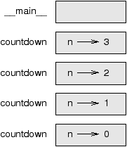 If n <= 0 the return statement exits the function. The flow of execution immediately returns to the caller, and the remaining lines of the function are not executed. The rest of the function is similar to countdown: if n is greater than 0, it displays s and then calls itself to display s n−1 additional times. So the number of lines of output is 1 + (n - 1), which adds up to n. For simple examples like this, it is probably easier to use a for loop. But we will see examples later that are hard to write with a for loop and easy to write with recursion, so it is good to start early. 5.9 Stack diagrams for recursive functionsIn Section 3.10, we used a stack diagram to represent the state of a program during a function call. The same kind of diagram can help interpret a recursive function. Every time a function gets called, Python creates a new function frame, which contains the function’s local variables and parameters. For a recursive function, there might be more than one frame on the stack at the same time. This figure shows a stack diagram for countdown called with n = 3: ![]() As usual, the top of the stack is the frame for The four countdown frames have different values for the parameter n. The bottom of the stack, where n=0, is called the base case. It does not make a recursive call, so there are no more frames. Draw a stack diagram for