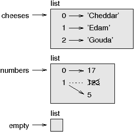 brackets, As you might expect, you can assign list values to variables: >>> cheeses = ['Cheddar', 'Edam', 'Gouda'] >>> numbers = [17, 123] >>> empty = [] >>> print cheeses, numbers, empty ['Cheddar', 'Edam', 'Gouda'] [17, 123] [] 10.2 Lists are mutableThe syntax for accessing the elements of a list is the same as for accessing the characters of a string—the bracket operator. The expression inside the brackets specifies the index. Remember that the indices start at 0: >>> print cheeses[0] Cheddar Unlike strings, lists are mutable. When the bracket operator appears on the left side of an assignment, it identifies the element of the list that will be assigned. >>> numbers = [17, 123] >>> numbers[1] = 5 >>> print numbers [17, 5] The one-eth element of numbers, which used to be 123, is now 5. You can think of a list as a relationship between indices and elements. This relationship is called a mapping; each index “maps to” one of the elements. Here is a state diagram showing cheeses, numbers and empty: ![]() Lists are represented by boxes with the word “list” outside and the elements of the list inside. cheeses refers to a list with three elements indexed 0, 1 and 2. numbers contains two elements; the diagram shows that the value of the second element has been reassigned from 123 to 5. empty refers to a list with no elements. List indices work the same way as string indices: