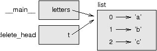 Here’s how it is used: >>> letters = ['a', 'b', 'c'] >>> delete_head(letters) >>> print letters ['b', 'c'] The parameter t and the variable letters are aliases for the same object. The stack diagram looks like this: ![]() Since the list is shared by two frames, I drew it between them. It is important to distinguish between operations that modify lists and operations that create new lists. For example, the append method modifies a list, but the + operator creates a new list: >>> t1 = [1, 2] >>> t2 = t1.append(3) >>> print t1 [1, 2, 3] >>> print t2 None >>> t3 = t1 + [3] >>> print t3 [1, 2, 3] >>> t2 is t3 False This difference is important when you write functions that are supposed to modify lists. For example, this function does not delete the head of a list: def bad_delete_head(t):