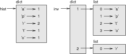 Each time through the loop, key gets a key from d and val gets the corresponding value. If val is not in inv, that means we haven’t seen it before, so we create a new item and initialize it with a singleton (a list that contains a single element). Otherwise we have seen this value before, so we append the corresponding key to the list. Here is an example: >>> hist = histogram('parrot')