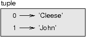 a list. For example, the tuple ![]() But in a larger diagram you might want to leave out the details. For example, a diagram of the telephone directory might appear: ![]() Here the tuples are shown using Python syntax as a graphical shorthand. The telephone number in the diagram is the complaints line for the BBC, so please don’t call it. 12.7 Comparing tuplesThe comparison operators work with tuples and other sequences; Python starts by comparing the first element from each sequence. If they are equal, it goes on to the next elements, and so on, until it finds elements that differ. Subsequent elements are not considered (even if they are really big). >>> (0, 1, 2) < (0, 3, 4) True >>> (0, 1, 2000000) < (0, 3, 4) True The sort function works the same way. It sorts primarily by first element, but in the case of a tie, it sorts by second element, and so on. This feature lends itself to a pattern called DSU for