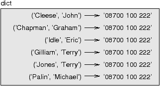 The output of this loop is: 0 a 2 c 1 b Again. It is common to use tuples as keys in dictionaries (primarily because you can’t use lists). For example, a telephone directory might map from last-name, first-name pairs to telephone numbers. Assuming that we have defined last, first and number, we could write: directory[last,first] = number The expression in brackets is a tuple. We could use tuple assignment to traverse this dictionary. for last, first in directory: