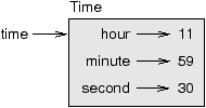 We can create a new Time object and assign attributes for hours, minutes, and seconds: time = Time() time.hour = 11 time.minute = 59 time.second = 30 The state diagram for the Time object looks like this: ![]() Exercise 1