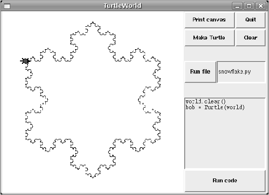 Modify your solution to Exercise 19.2 by adding an Entry widget and a second button. When the user presses the second button, it should read a color name from the Entry and use it to change the fill color of the circle. Use config to modify the existing circle; don’t create a new one. Your program should handle the case where the user tries to change the color of a circle that hasn’t been created, and the case where the color name is invalid. You can see my solution at thinkpython.com/code/circle_demo.py. 19.6 Packing widgetsSo far we have been stacking widgets in a single column, but in most GUIs the layout is more complicated. For example, here is a slightly simplified version of TurtleWorld (see Chapter 4).